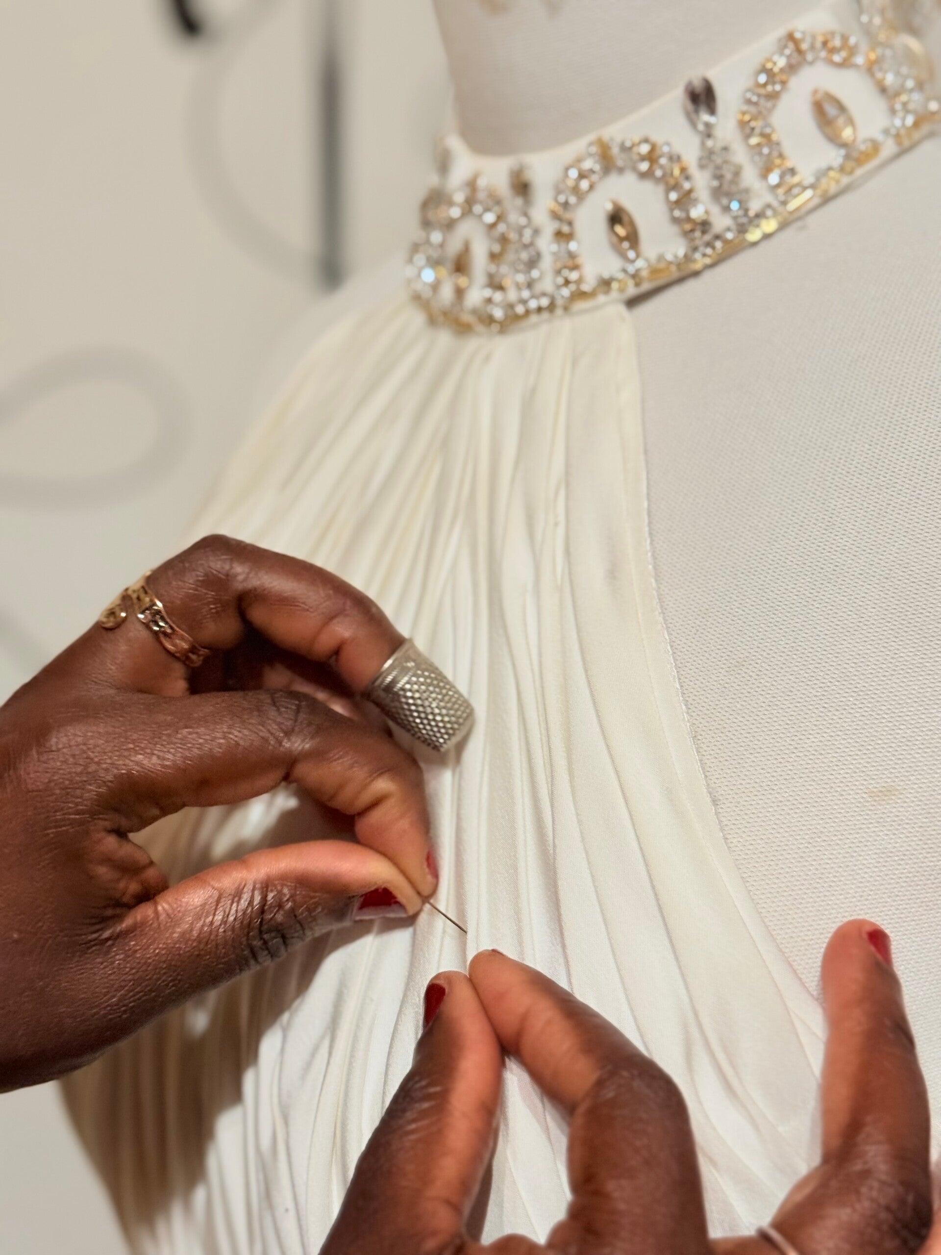 Grâce à son expérience en haute couture, Theresa Mano propose un service de retouches fines et d’embellissement textile :