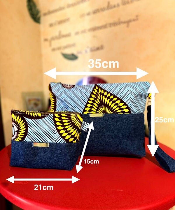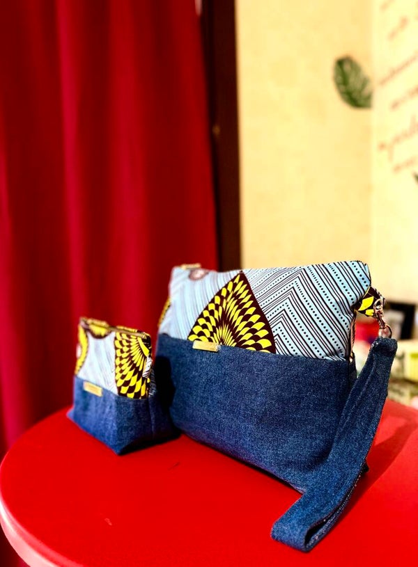 Ce magnifique duo de trousses allie la modernité du jean à l’éclat du wax jaune pour un style à la fois chic et audacieux.
